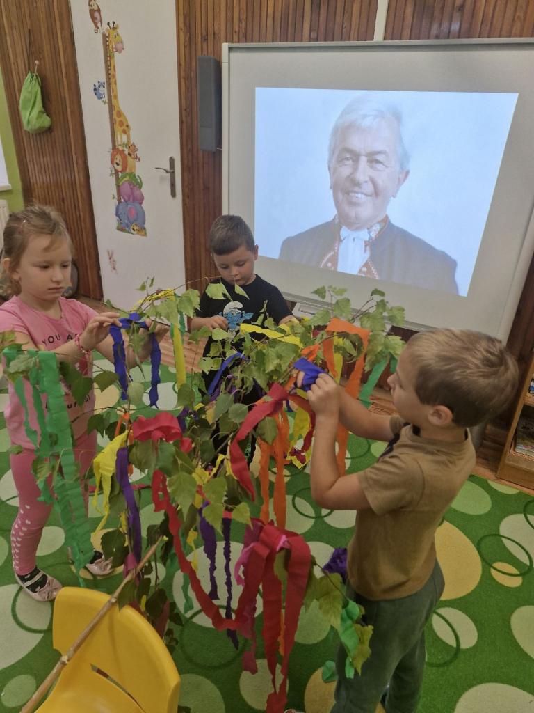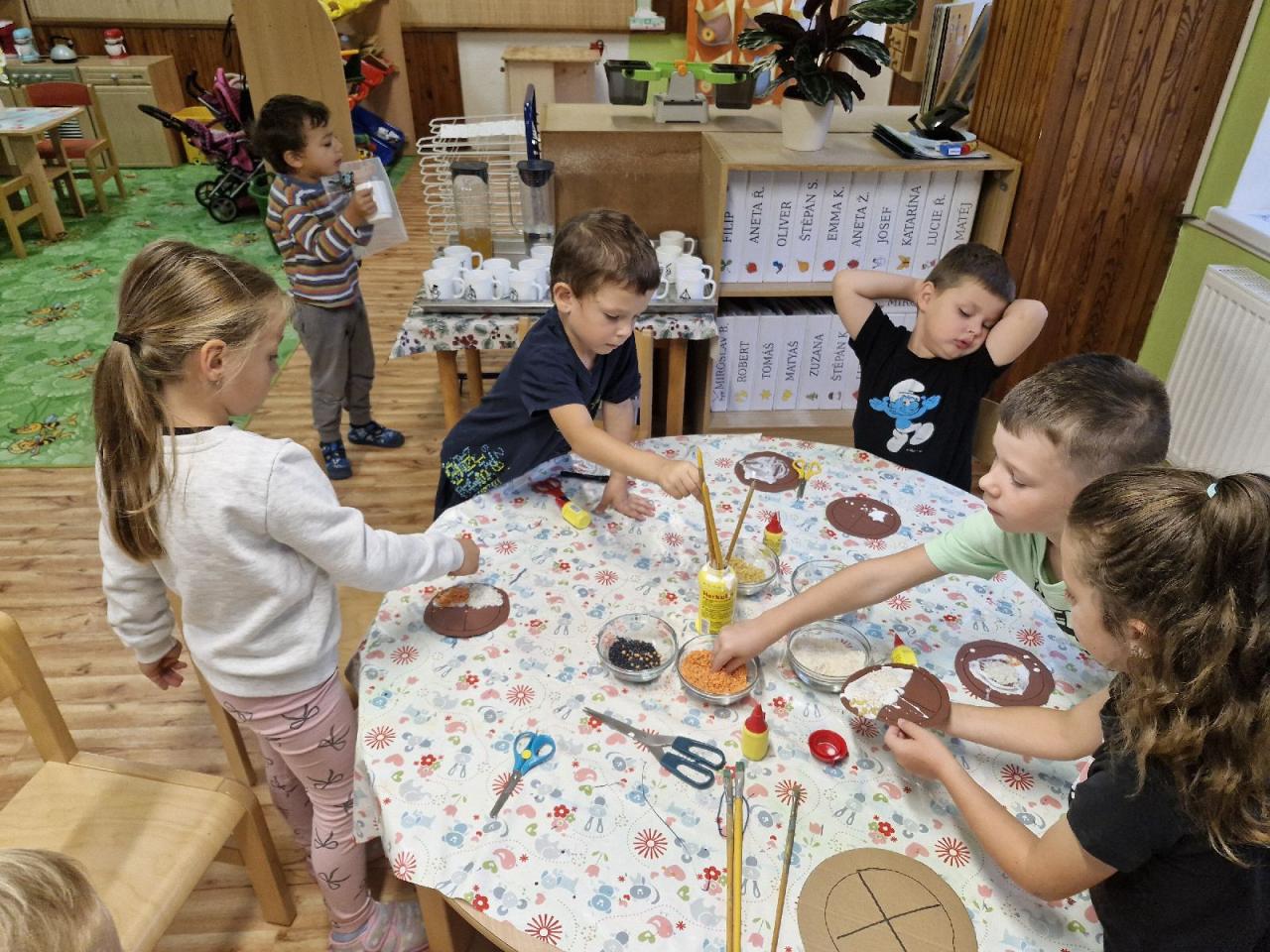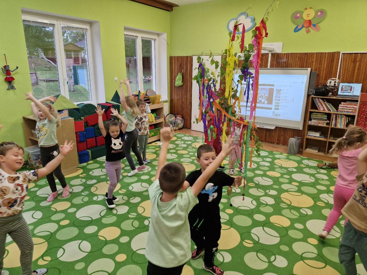 V druhé polovině září jsme se zaměřili na téma „Tam, kde jsme, nám může být dobře.“ Povídali jsme si o naší obci Práče, o tom, co tu máme rádi, a připomněli jsme si místní tradici Svatováclavských krojovaných hodů. Upekli jsme voňavé koláčky, postavili jsme si vlastní „májku“ a užili si společné chvíle plné spolupráce a pohody.